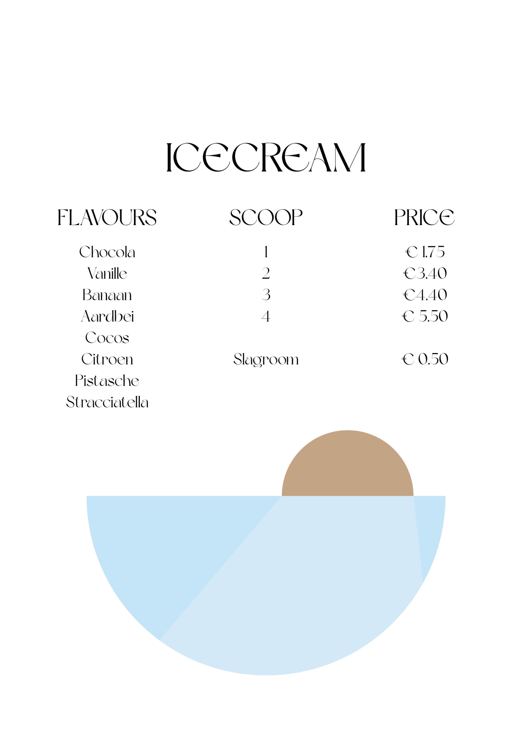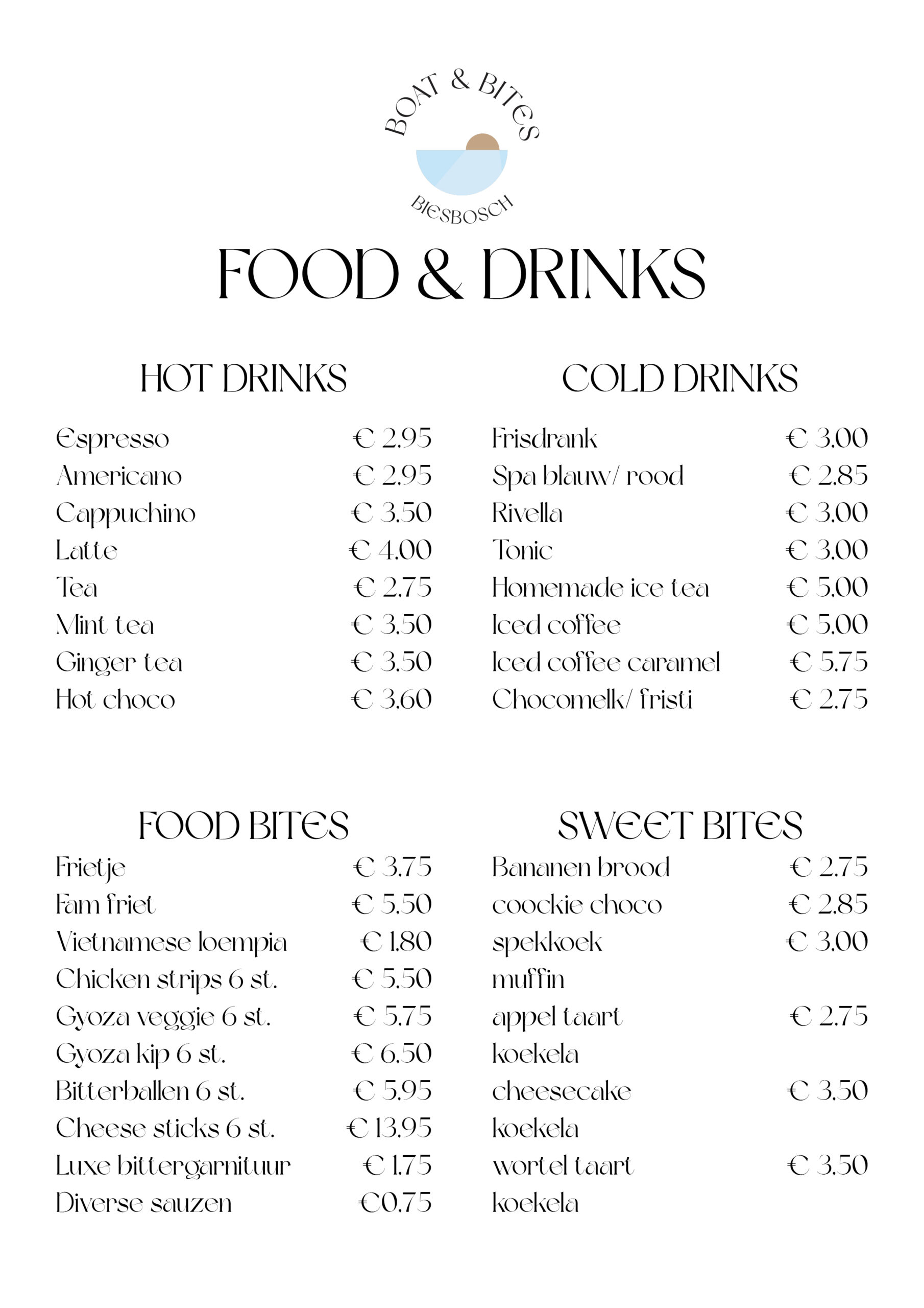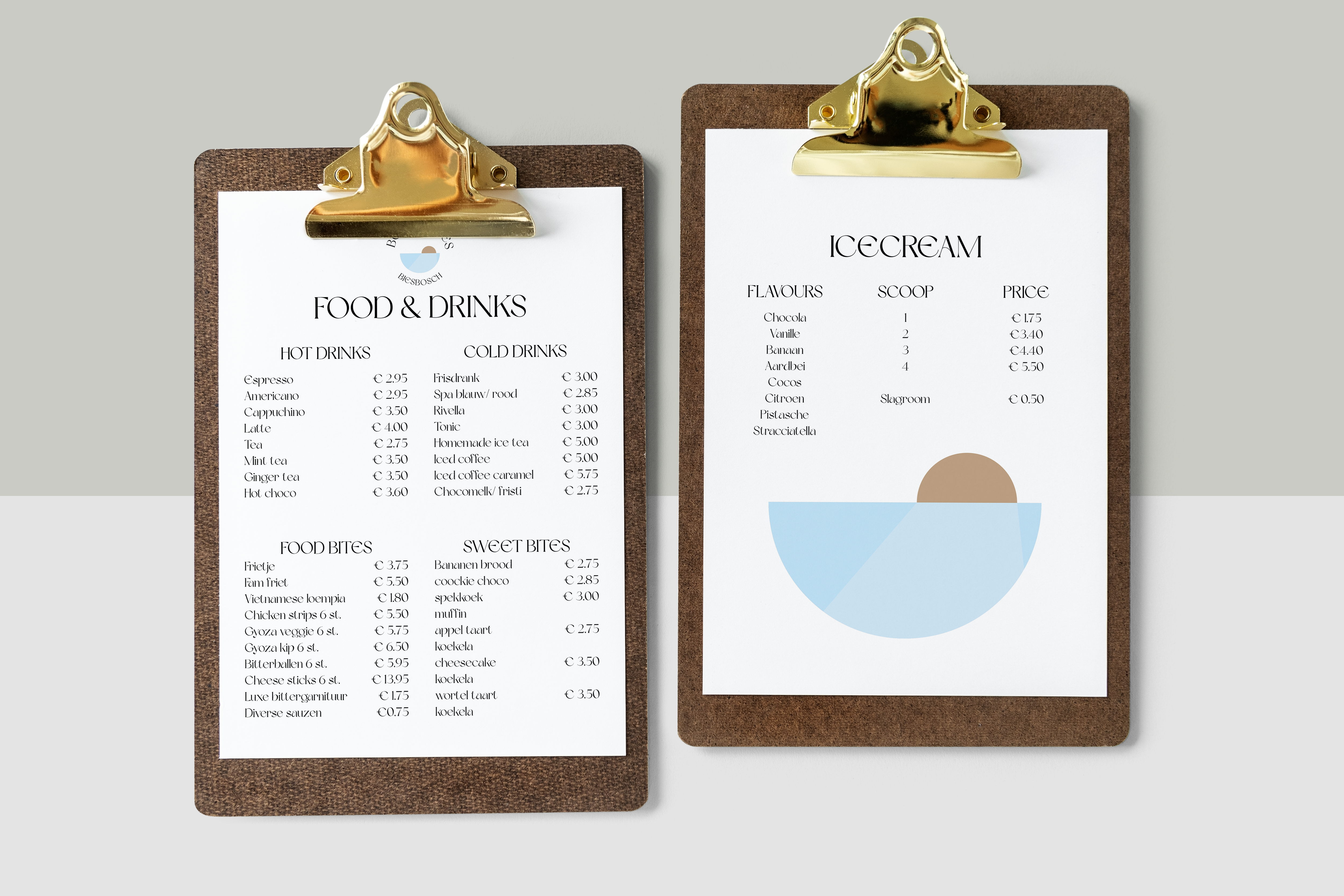 Voor deze opdracht kwam de klant bij ons langs op school. Zij vertelde dat ze een verhuurbedrijf heeft waar ze sloepen en sup borden verhuurt aan de Brabantse Biesbosch. Daarnaast heeft ze een terras waar je een hapje en drankje kan doen. Ze had nog geen vormgeving, dus aan ons was om een logo met beeldmerk voor haar te ontwerpen. Daarnaast heb ik ook een menukaart voor het terrasje ontworpen.