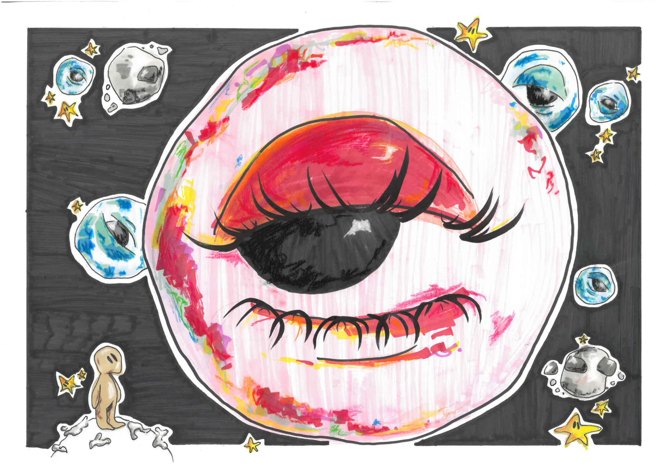 De opdracht voor dit werk was om een illustratie te maken bij een van Jules Deelder zijn gedichten. Ik heb het gedicht Heelal gekozen voor deze opdracht, omdat ik het een interessant onderwerp vond. Onderin mijn illustratie zie je een klein mannetje staan die naar het enorme heelal en de planeten kijkt.