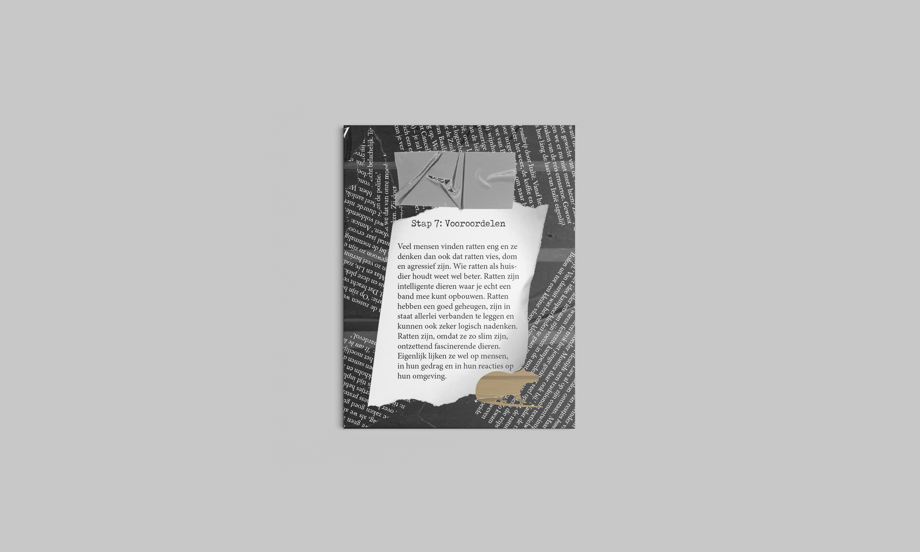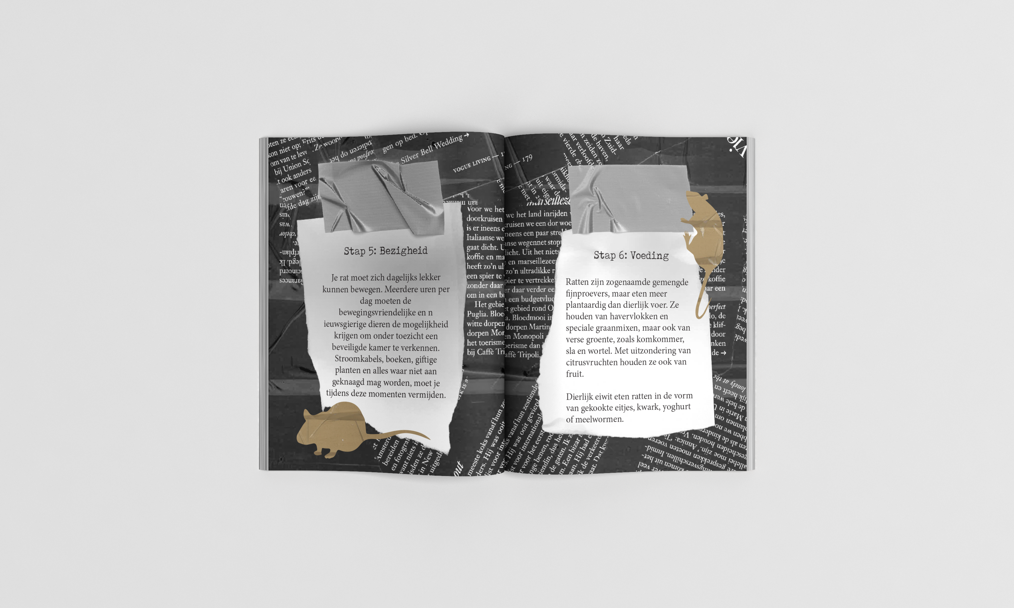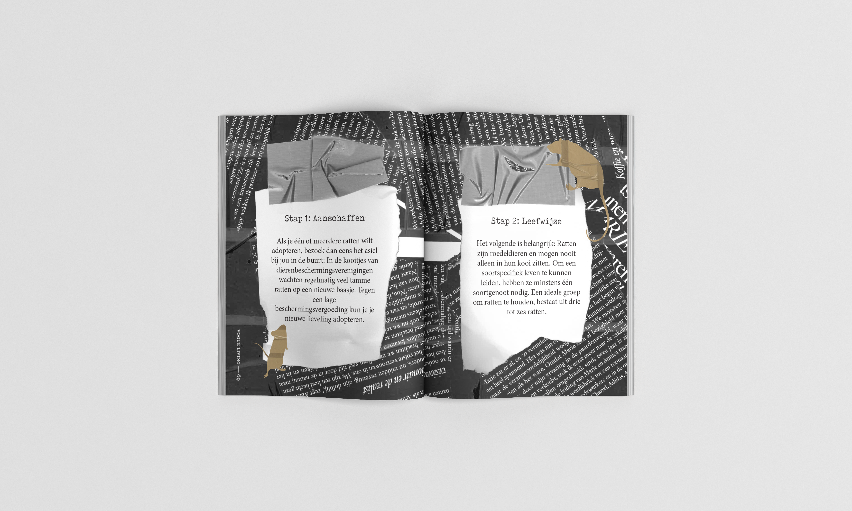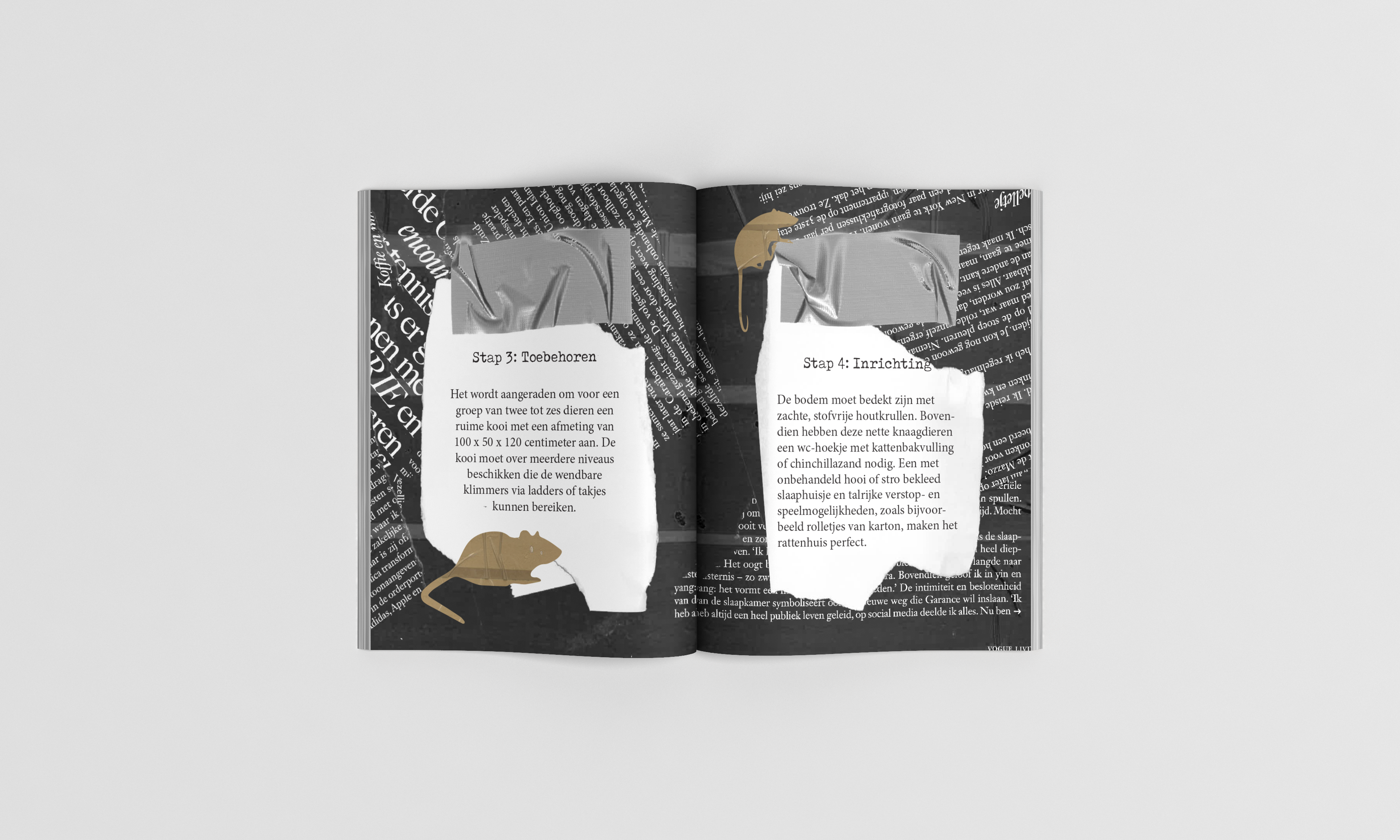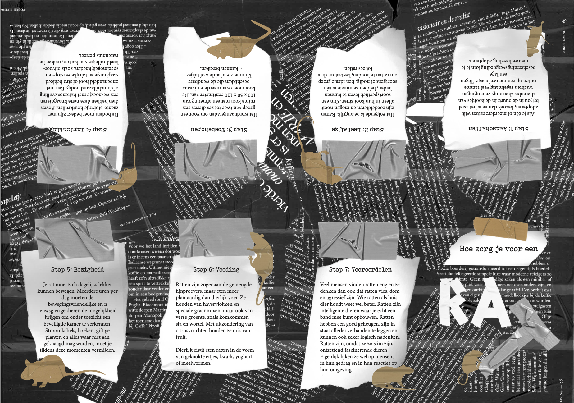De opdracht hiervoor was om een minizine te maken uit handmatige bestaande delen. Ik heb hiervoor van alles ingescand, vervormd/aangepast, opnieuw ingescand en zo verder gegaan. Uiteindelijk heb ik alles samengevat in Indesign. Mijn onderwerp voor dit minizine is: hoe zorg je voor ratjes, omdat ik ratjes super leuke en interessante dieren vind en ik hier graag iets mee wilde doen.